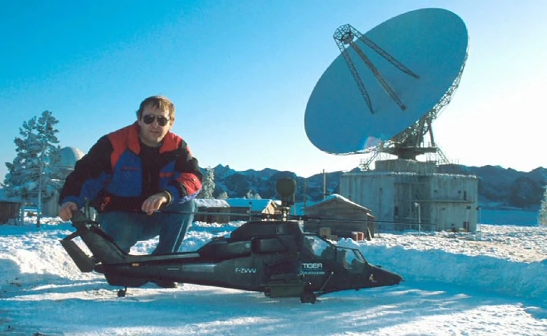 Nigel Blake with his remote control Tiger helicopter miniature in front of Derek Meddings miniature Severnaya set.